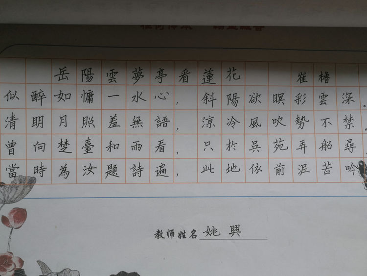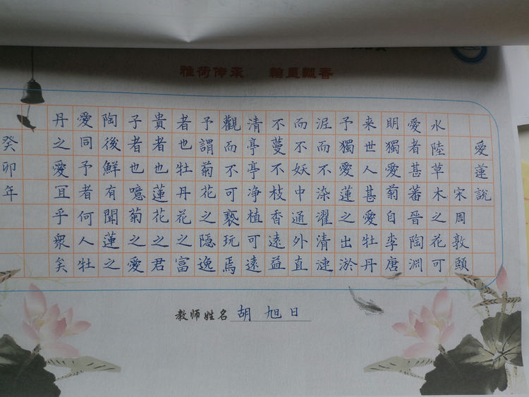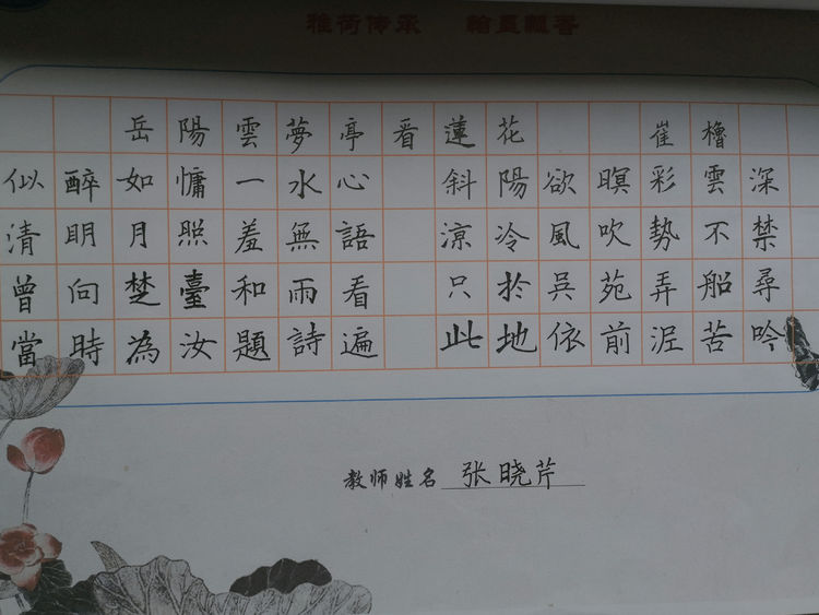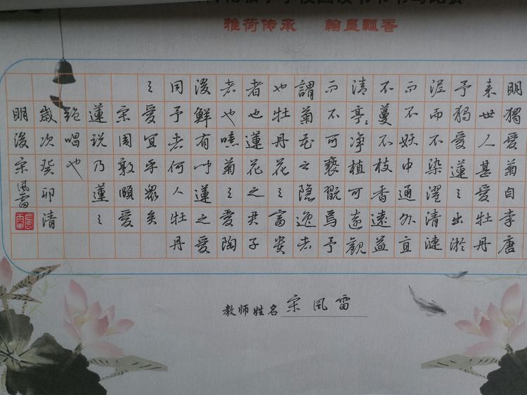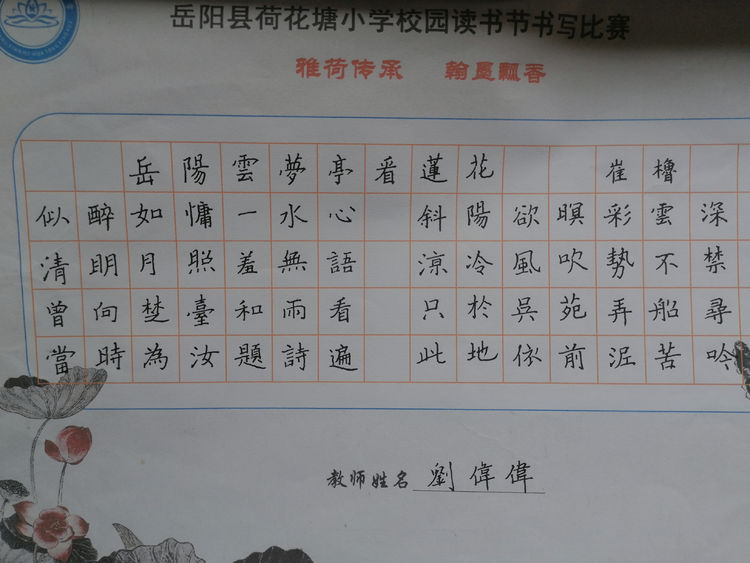 硬笔书法作品由学校提供关于荷花的诗文内容,统一发自主精心设计的比赛专用纸,学生比赛每班选三名代表按年级现场书写,限时交作品,教师硬笔比赛因要上课,难以统一集中,各自书写后上交。