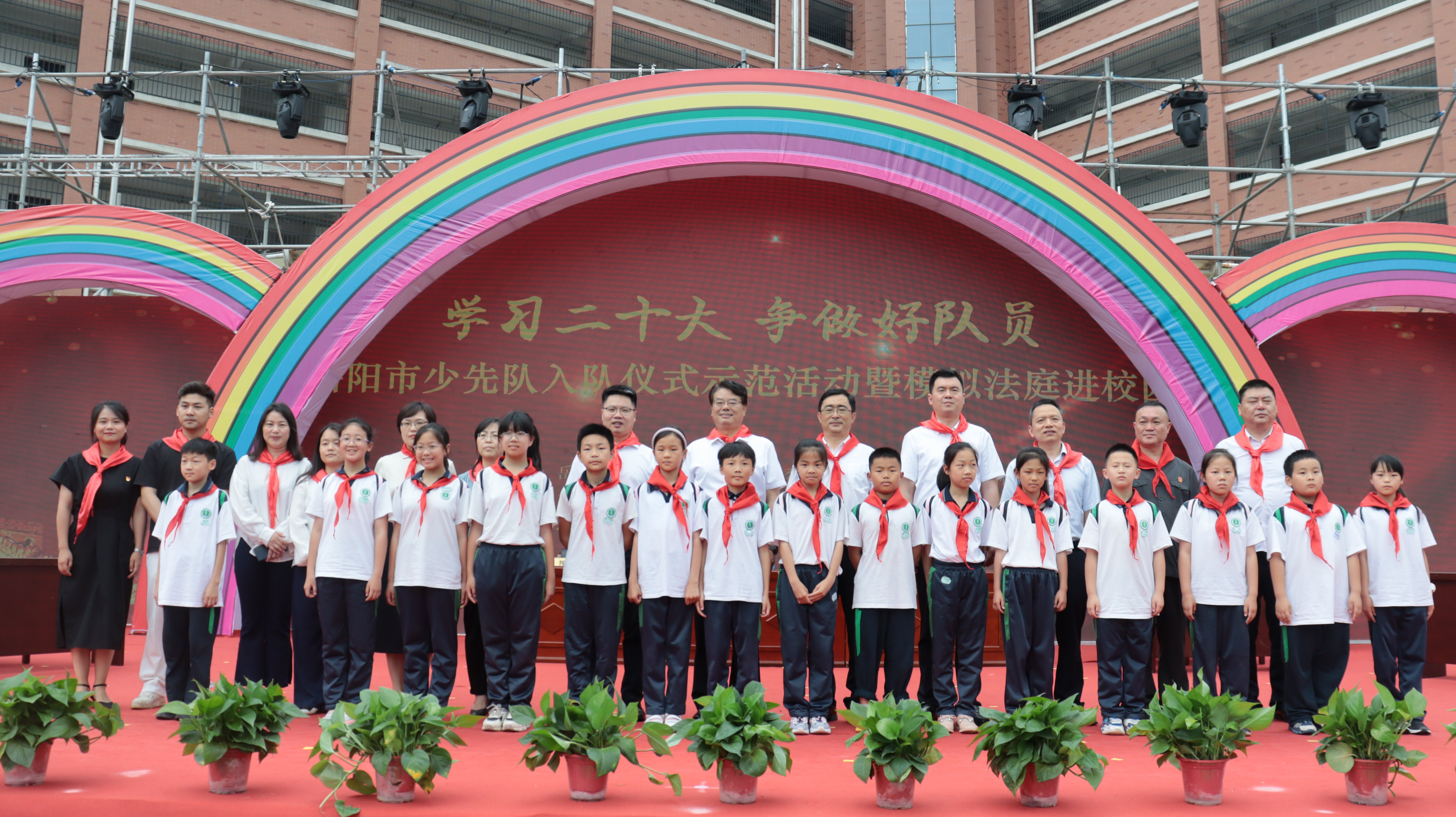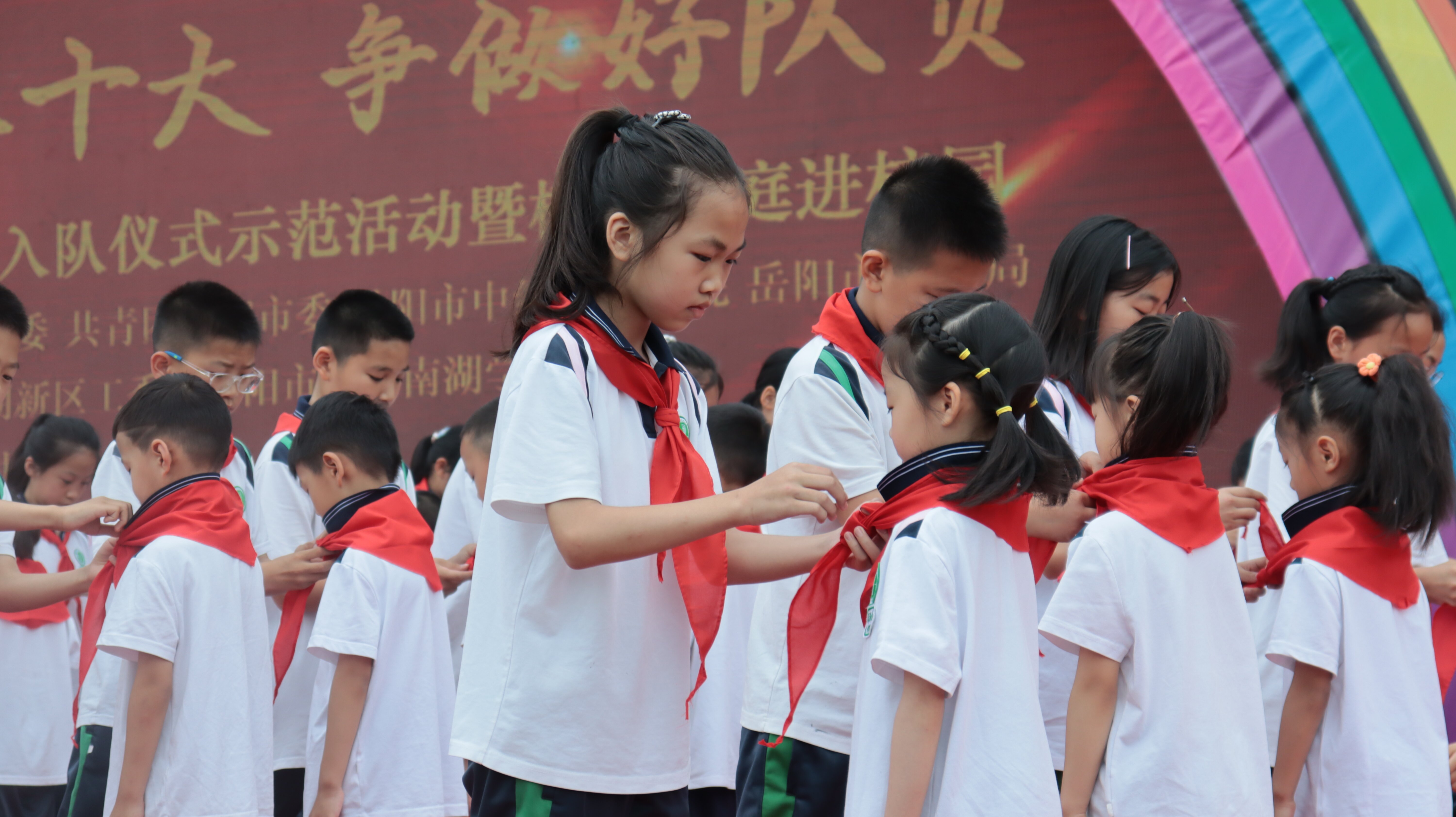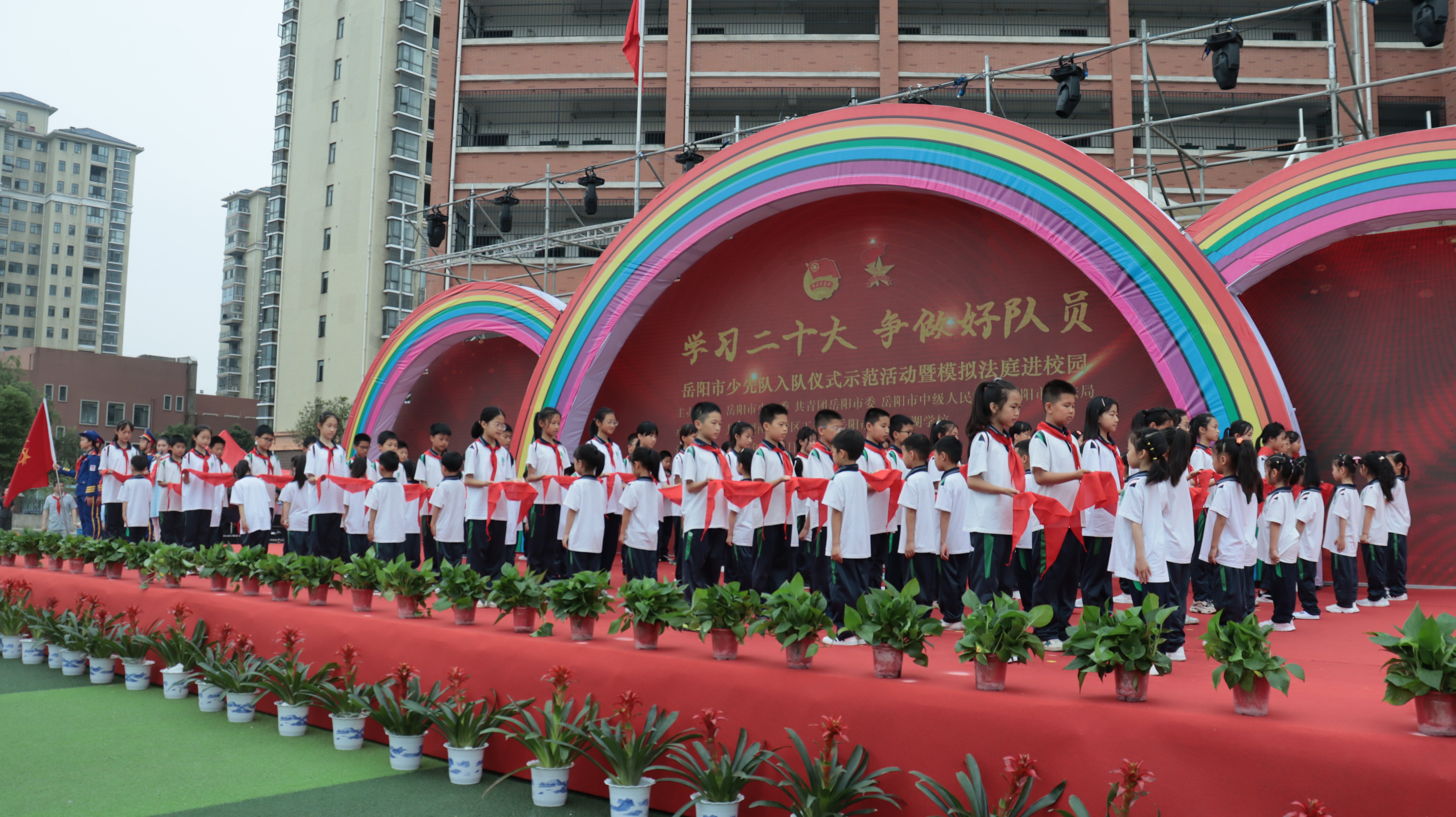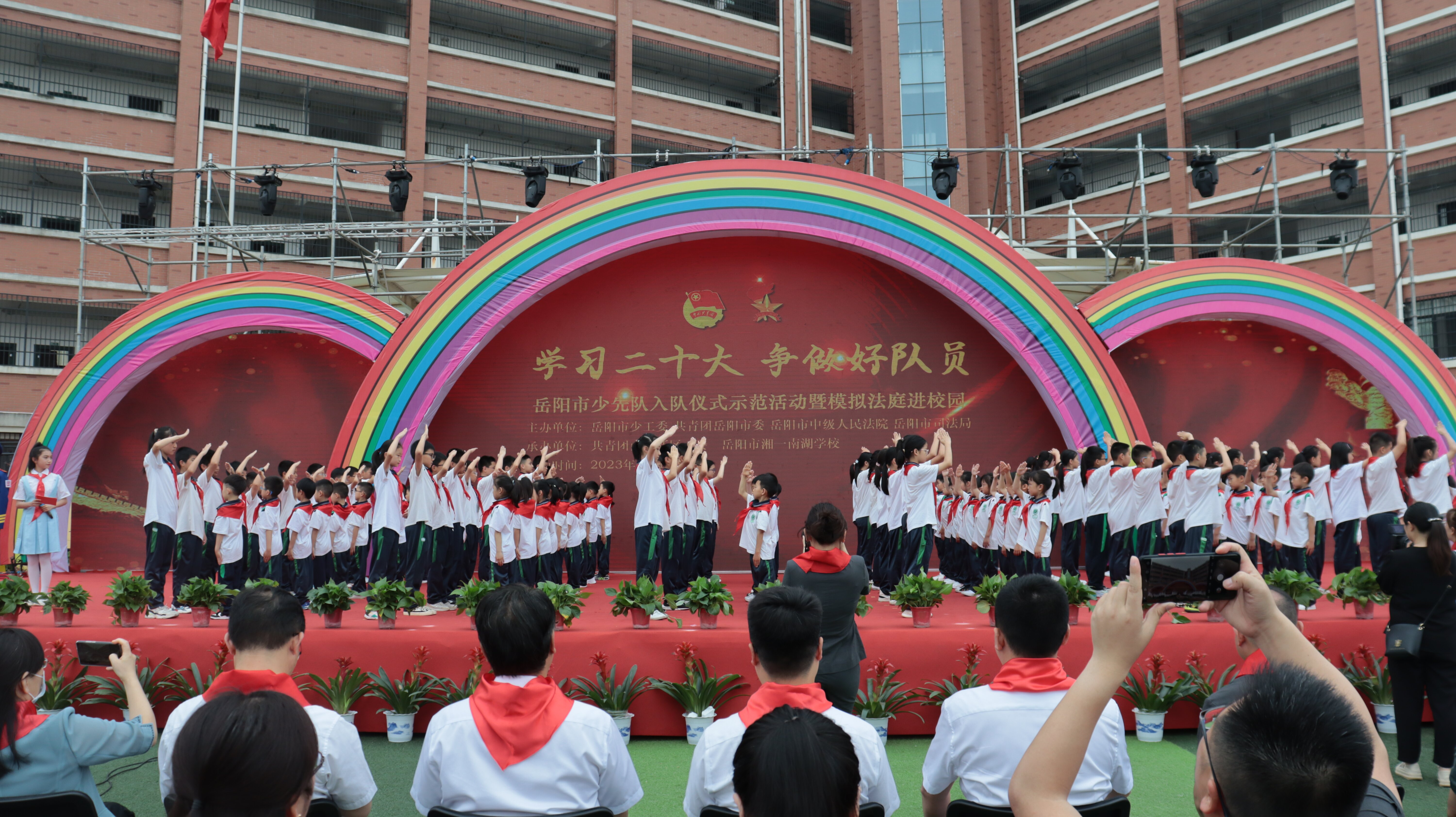 岳阳市红领巾电视台(通讯员\黄志勇 刘丽平 陈红丽)鲜艳的红领巾在胸前飘扬,幸福的微笑在脸上荡漾。六月一日,孩子们迎来了属于自己的节日——“六一”国际儿童节。为了引导广大少年儿童继承和发扬中国少年先锋队的光荣传统,扣好人生第一粒扣子,度过一个愉快而有意义的节日,上午9时,以“学习二十大 争做好队员”为主题的岳阳市少先队入队仪式示范活动暨模拟法庭进校园活动在湘一南湖学校绿茵球场举行。