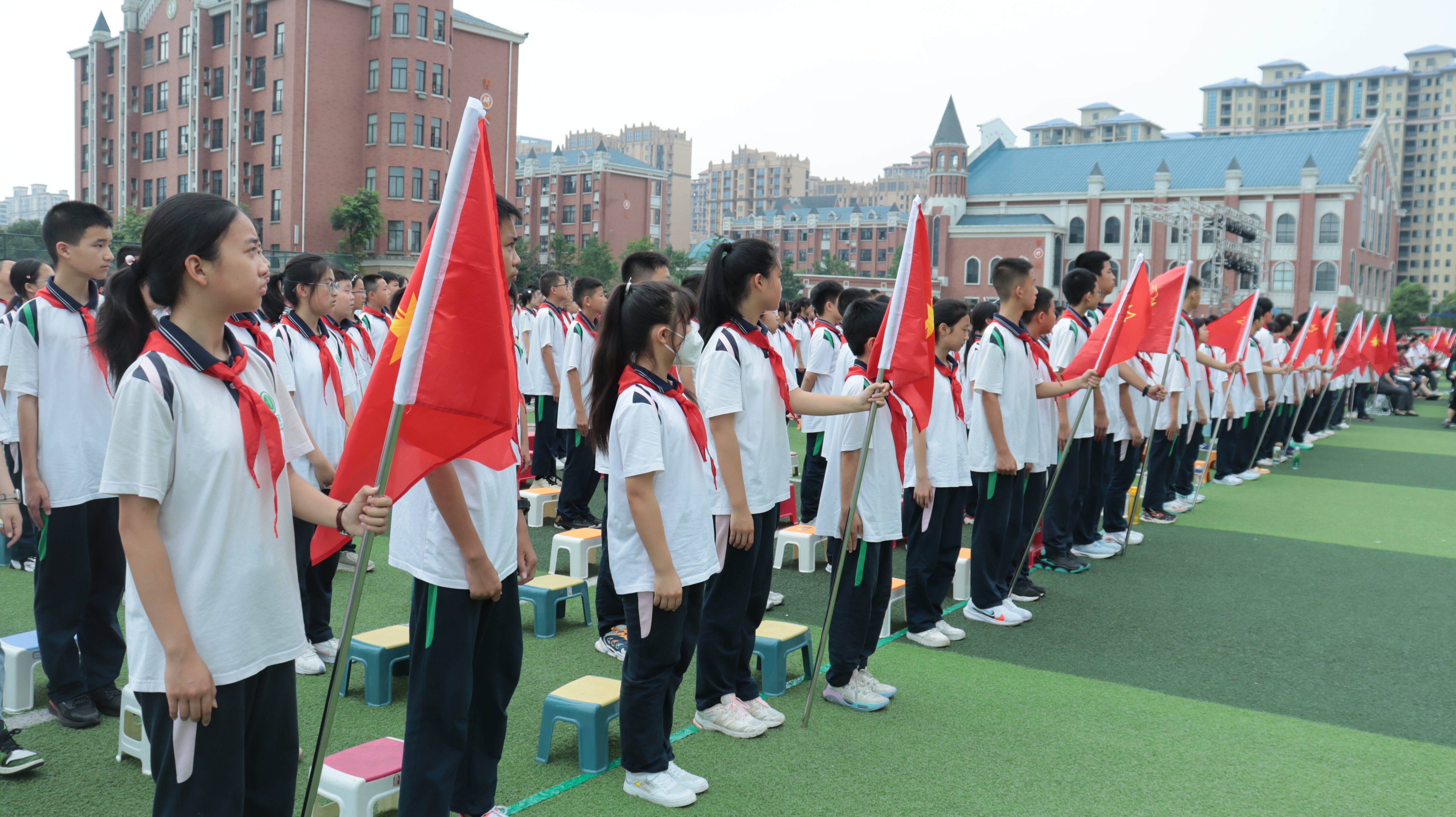 五年级少先队员代表为新队员佩戴红领巾,小队员们庄严地献上自己人生中的第一个少先队队礼,胸前飘扬的红领巾映衬着一张张喜悦自豪的笑脸格外鲜亮明艳。