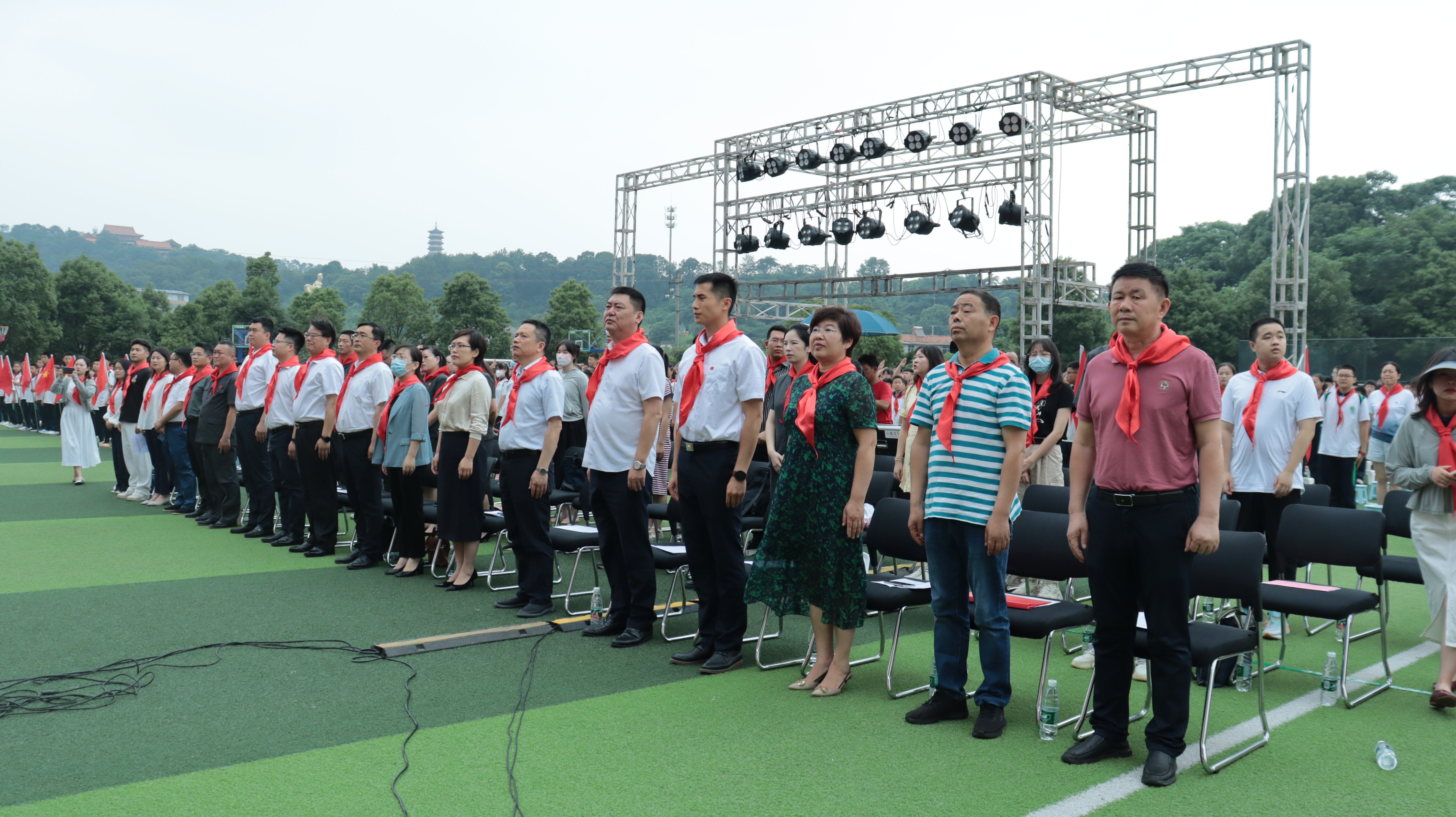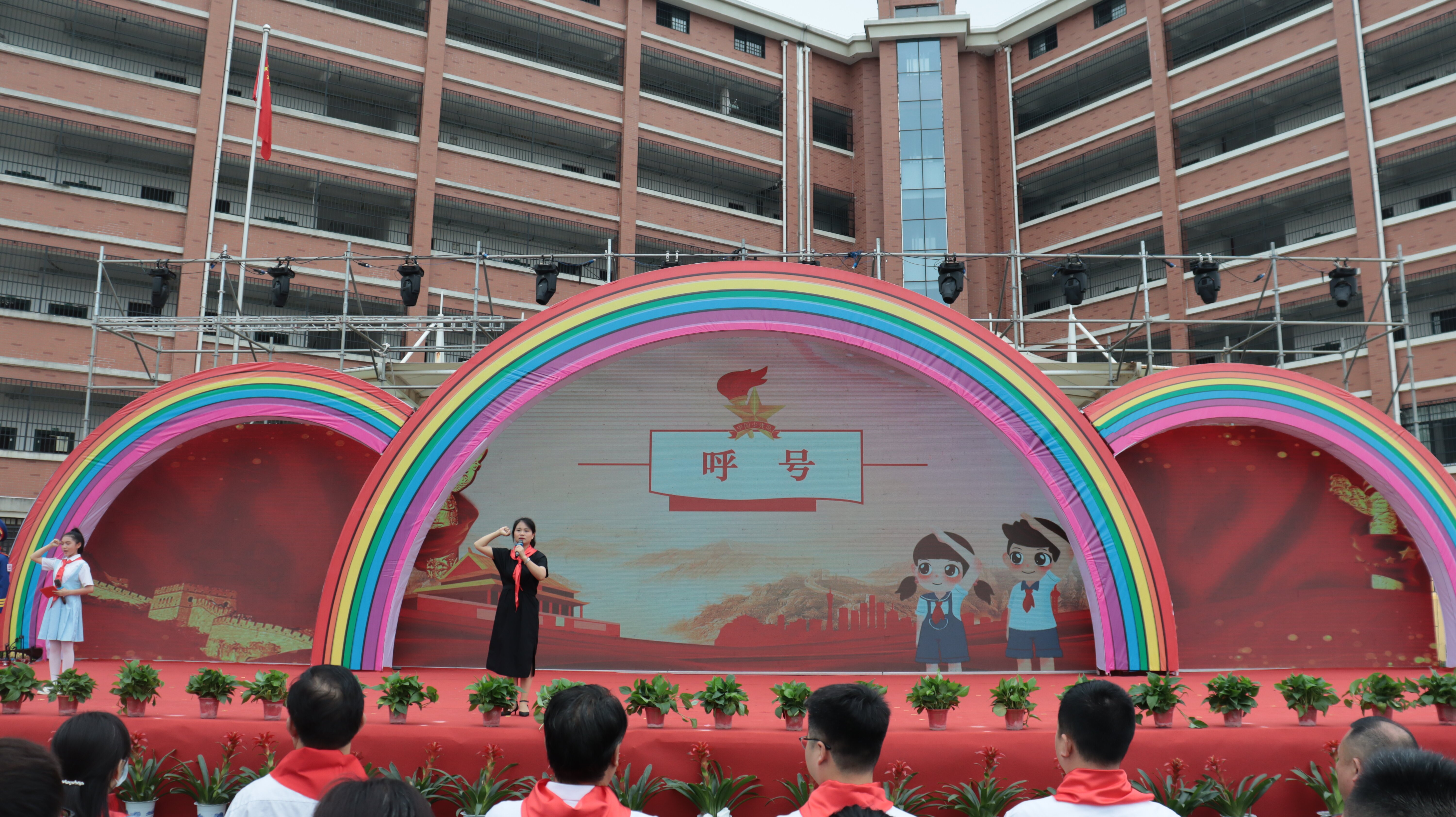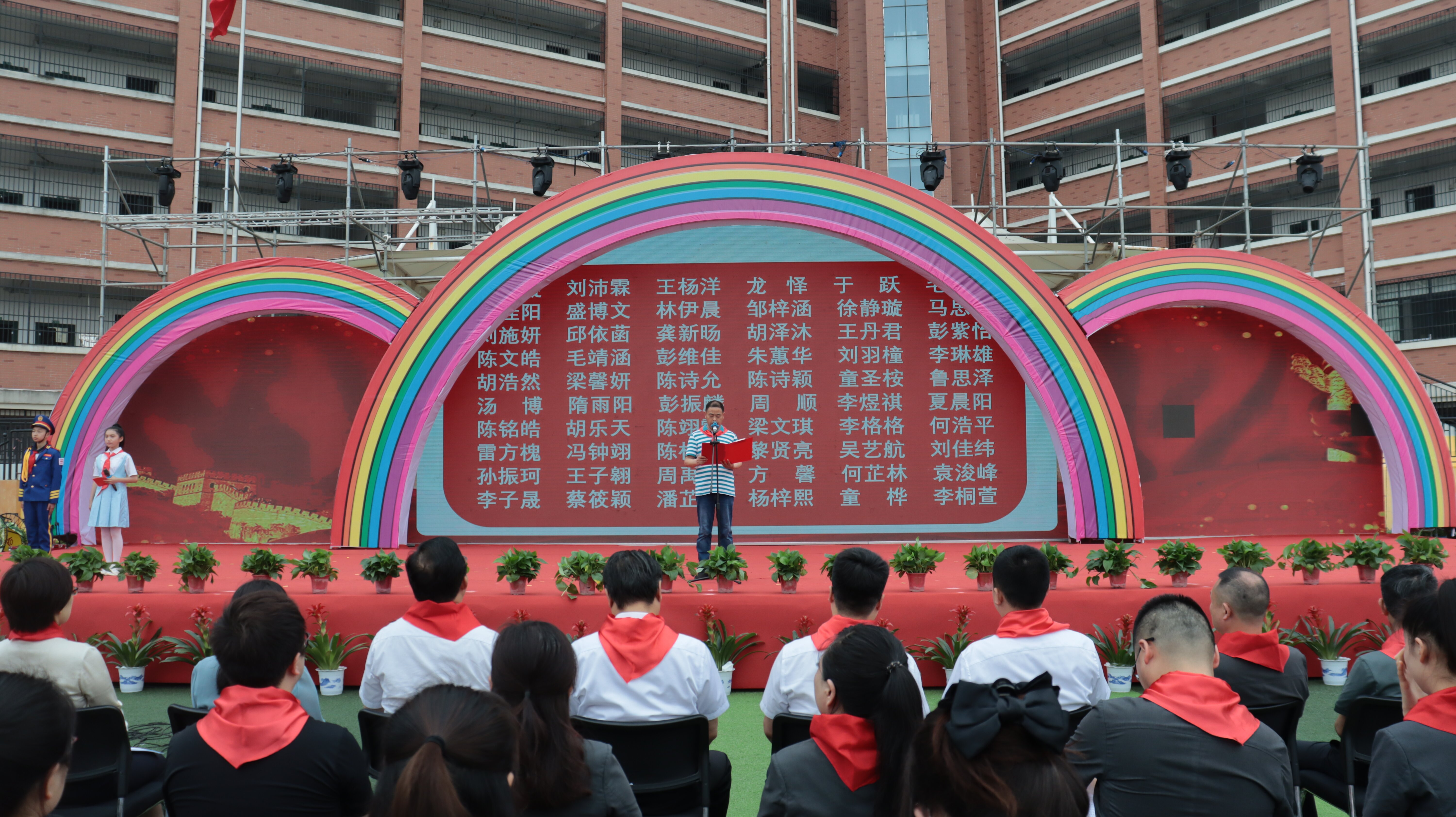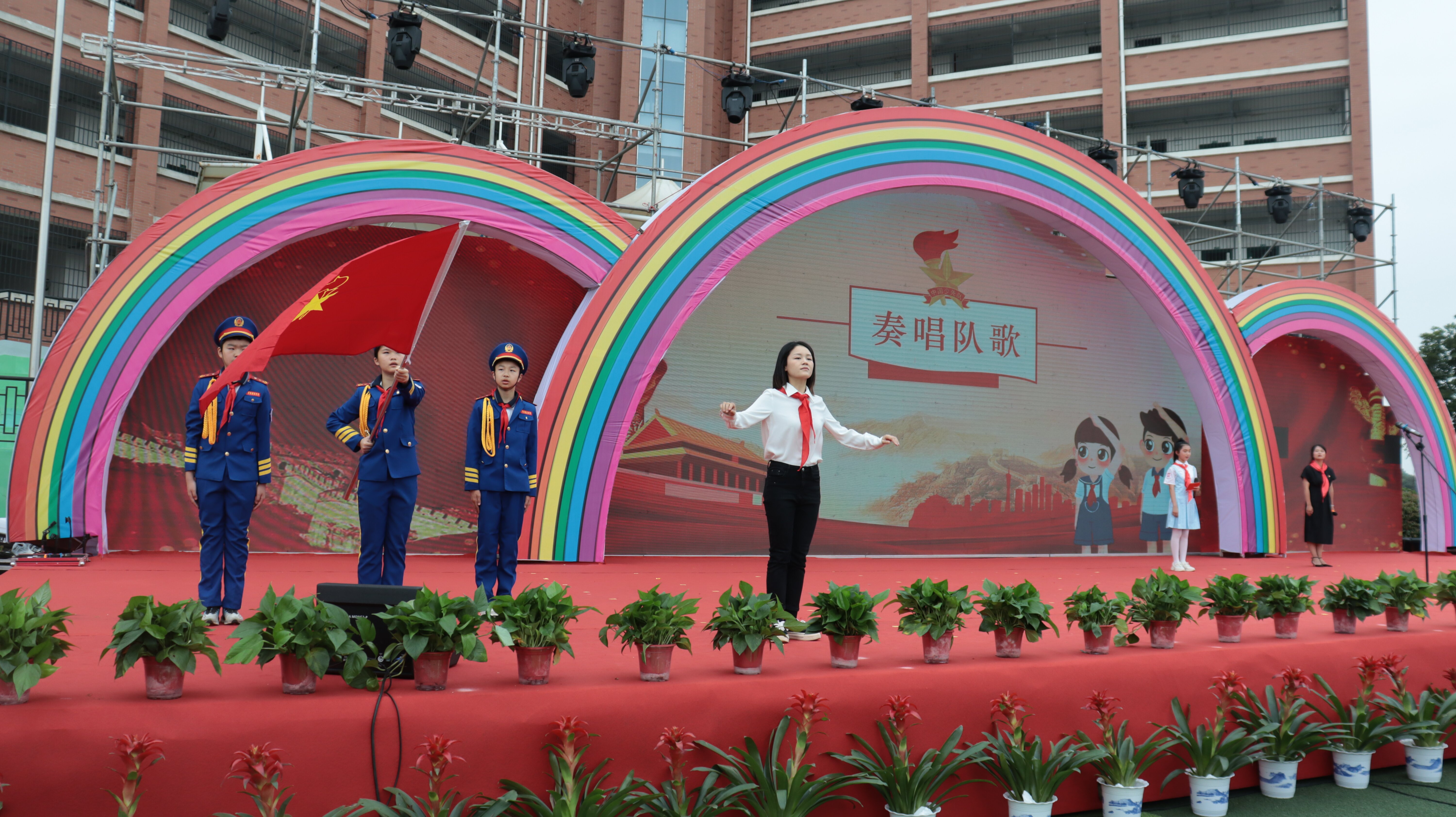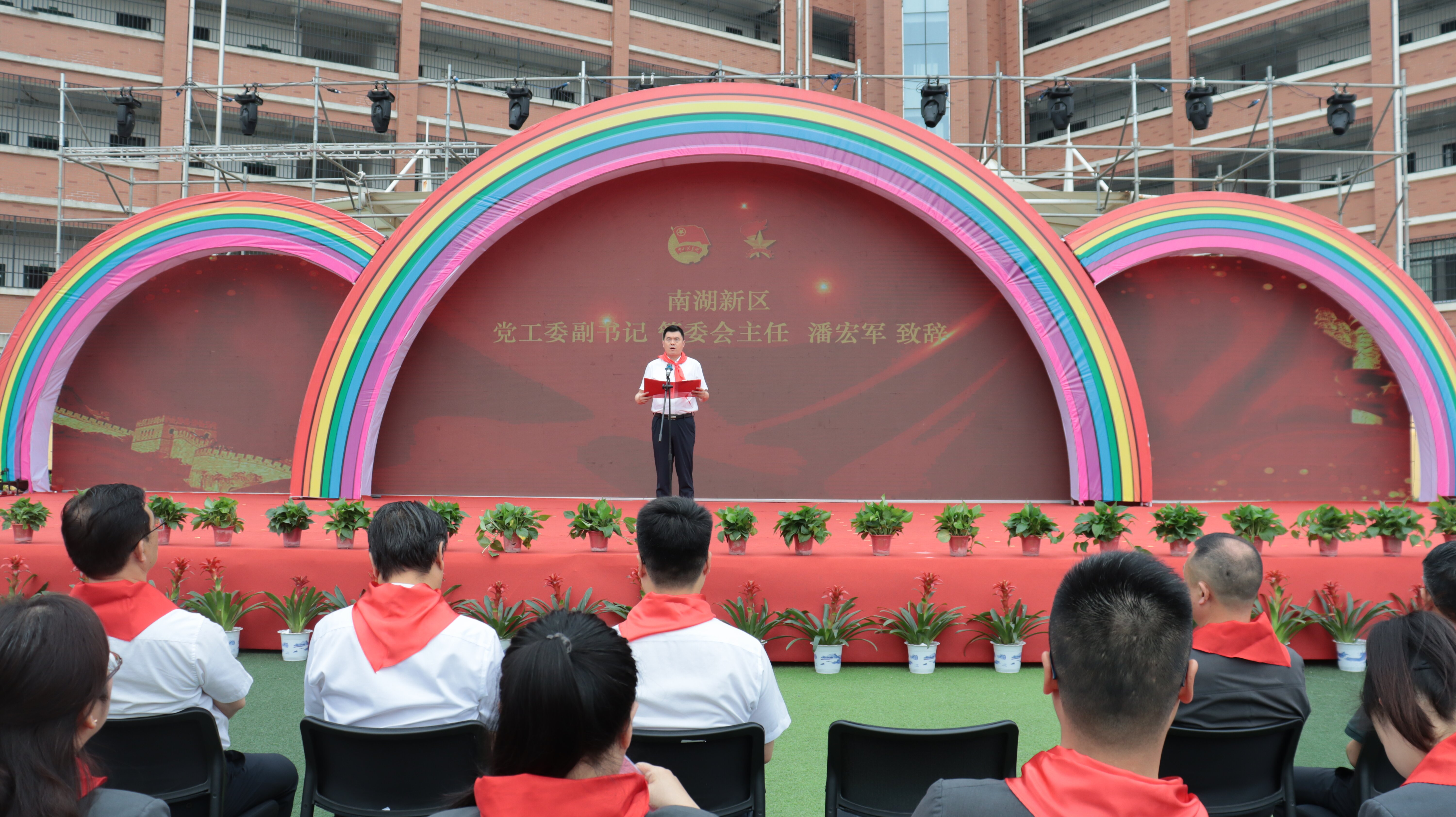 润泽红色基因、凝聚奋进力量。雄壮的国歌响起,鲜艳的五星红旗升起。南湖新区党工委副书记、管委会主任潘宏军走向舞台向现场少年儿童致以节日的祝福,勉励孩子们“坚持童心向党,磨炼坚强意志,锻炼强健体魄,做尊师孝老的好榜样、学习优异的好标兵、社会公德的好卫士、勇于创新的好少年。”