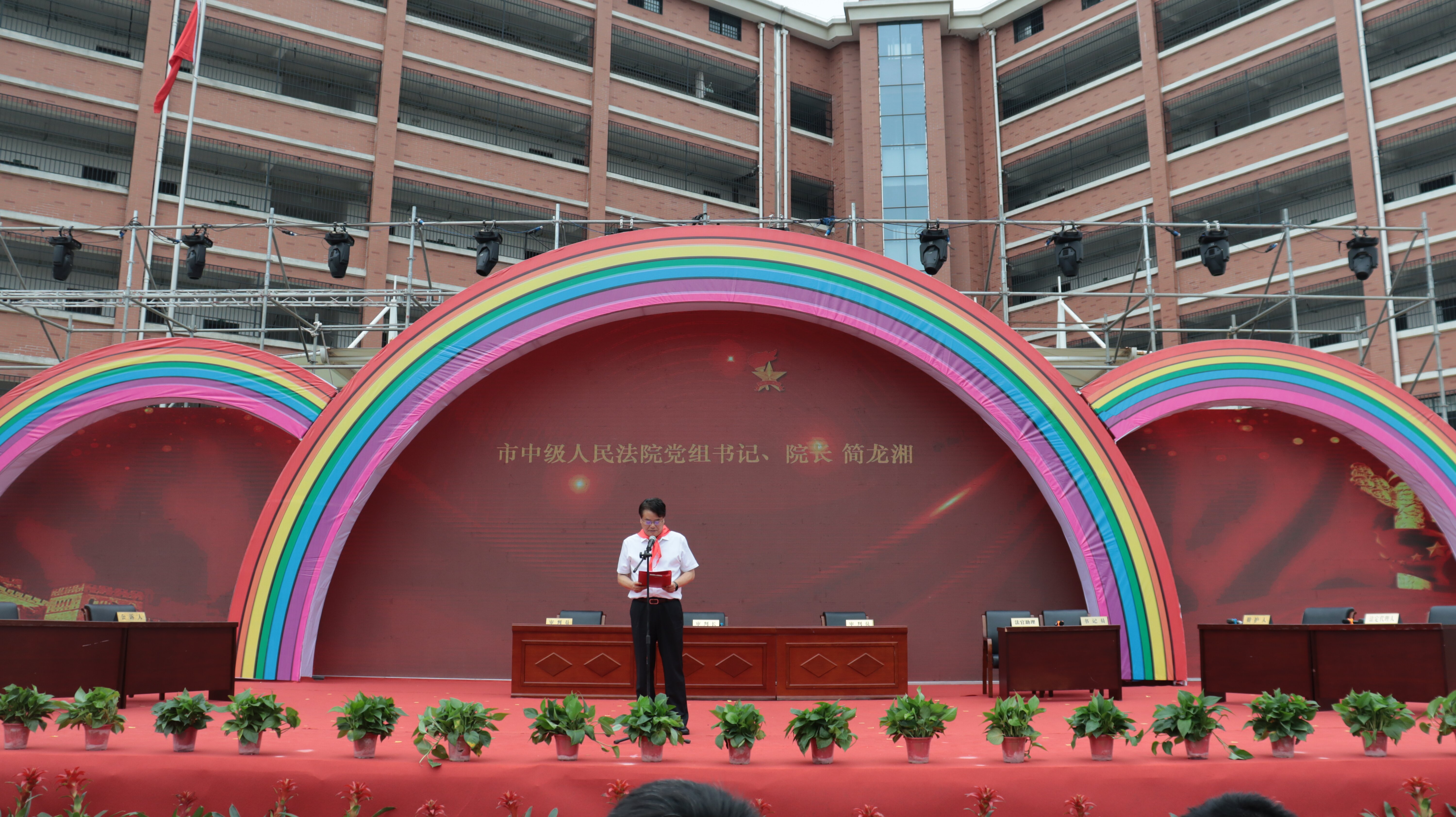 市中级人民法院党组书记、院长简龙湘围绕未成年人保护法和预防未成年人犯罪法等与青少年相关的法律法规进行解读,进一步帮助学生们明确法律底线、强化规则意识,增强安全自护意识。他指出,这是一堂薪火相传的政治启蒙课,这是一堂身临其境的法治实践课,这是一堂生动活泼的成果展示课,观看同学们精彩的节目表演,聆听新队员铿锵的入队誓言,感受到大家自立、自信、自强,从大家身上看到了无限可能!这都充分展示了“党建带团建、团建带队建”的丰硕成果,这也是家庭教育、学校教育、社会教育、自我教育相辅相成的生动展示。新时代、新征程,我们都更有责任和义务守护未成年人健康成长!