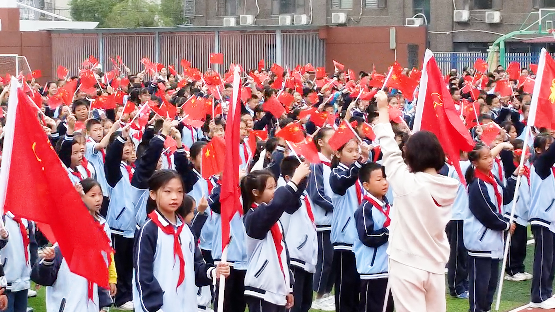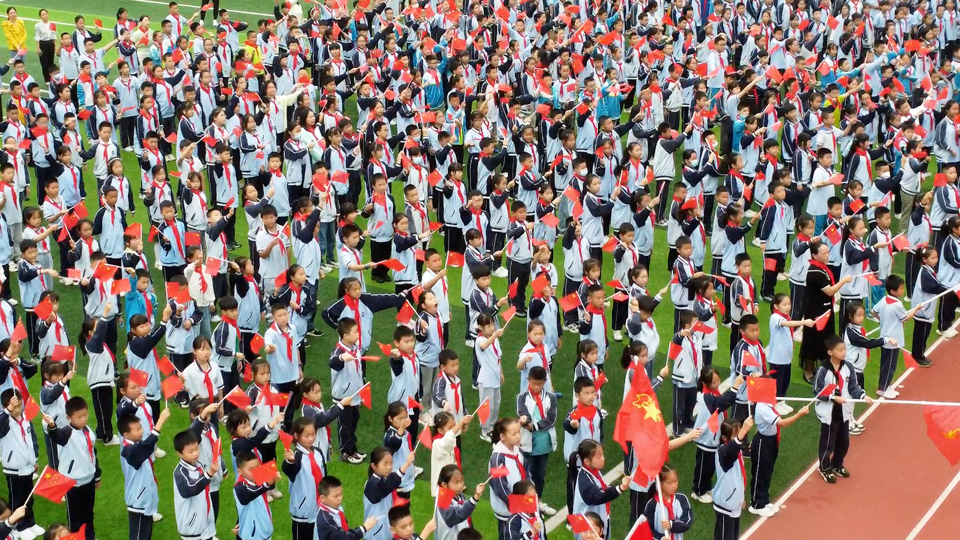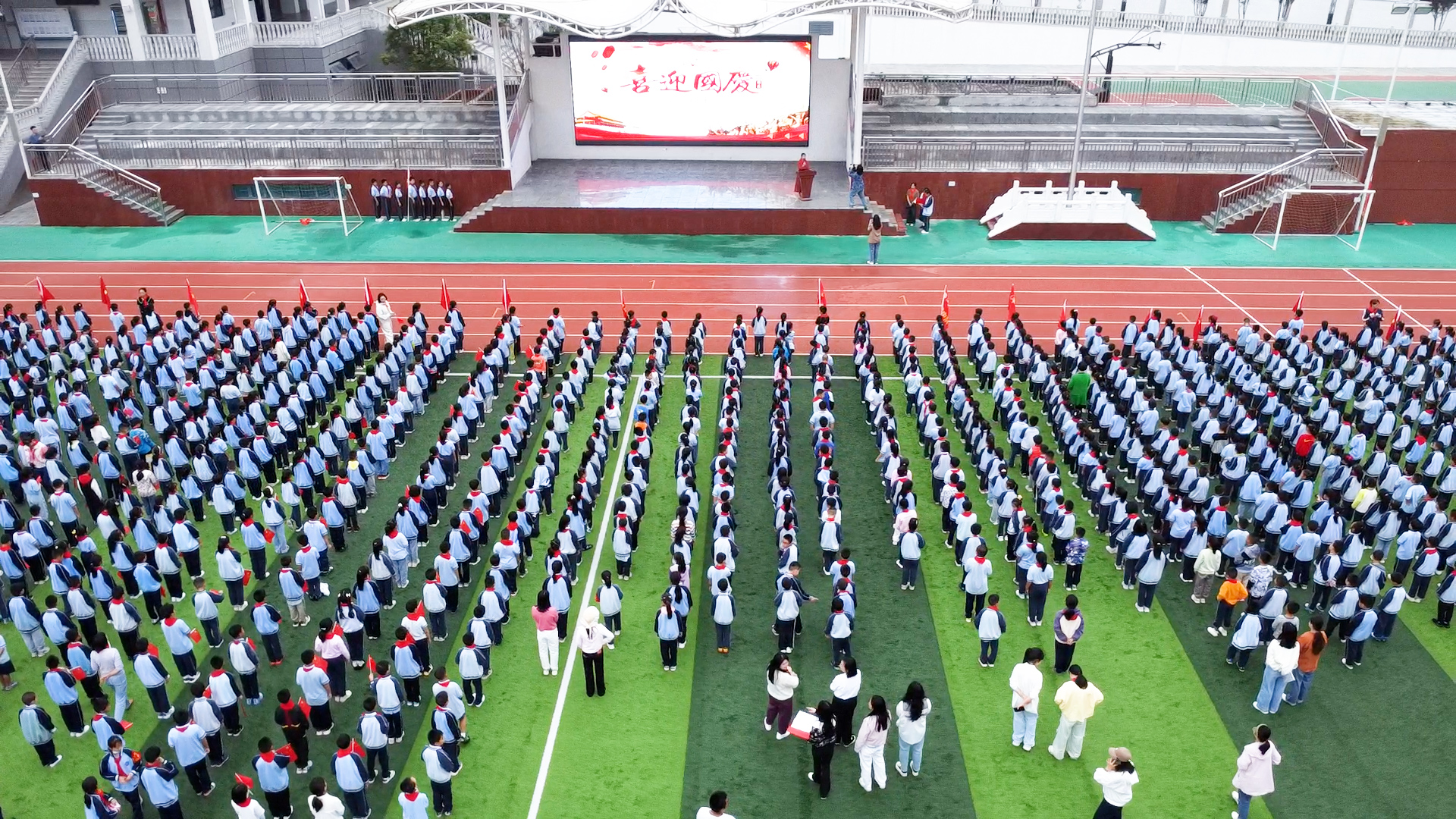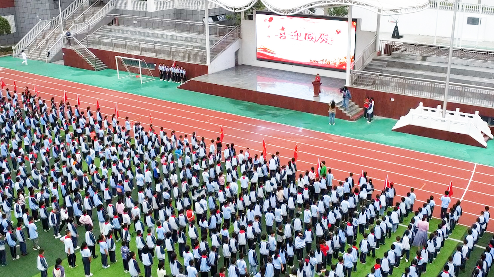 最后,全体师生挥舞着手中的红旗,在《我和我的祖国》歌声中,向祖国母亲送上了最美好的祝愿。