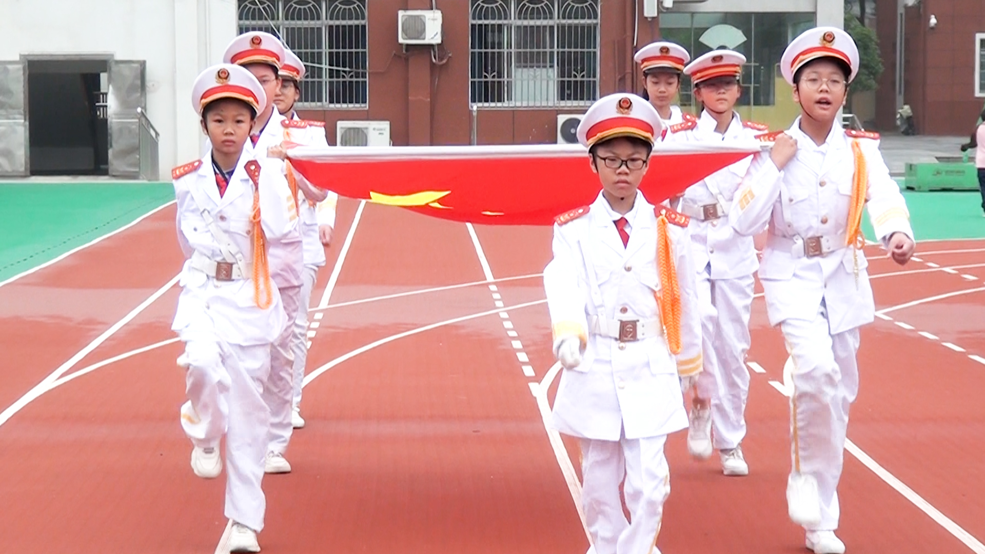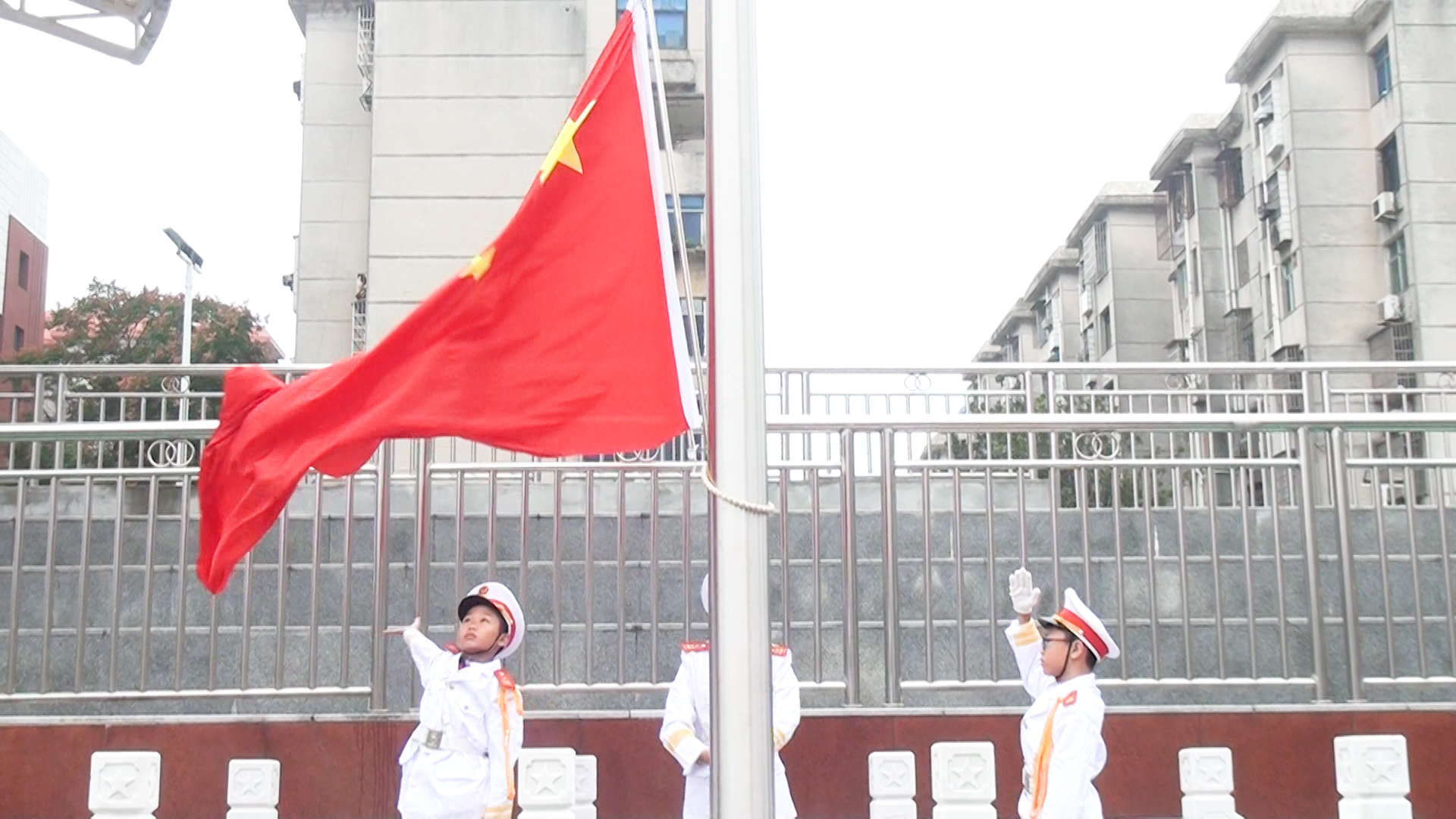 在庄严的国歌声中,国旗护卫队迈着整齐划一的步伐,护卫着鲜艳的五星红旗入场。五星红旗冉冉升起,全体师生庄严肃立,在国旗下许下庄重的誓言。