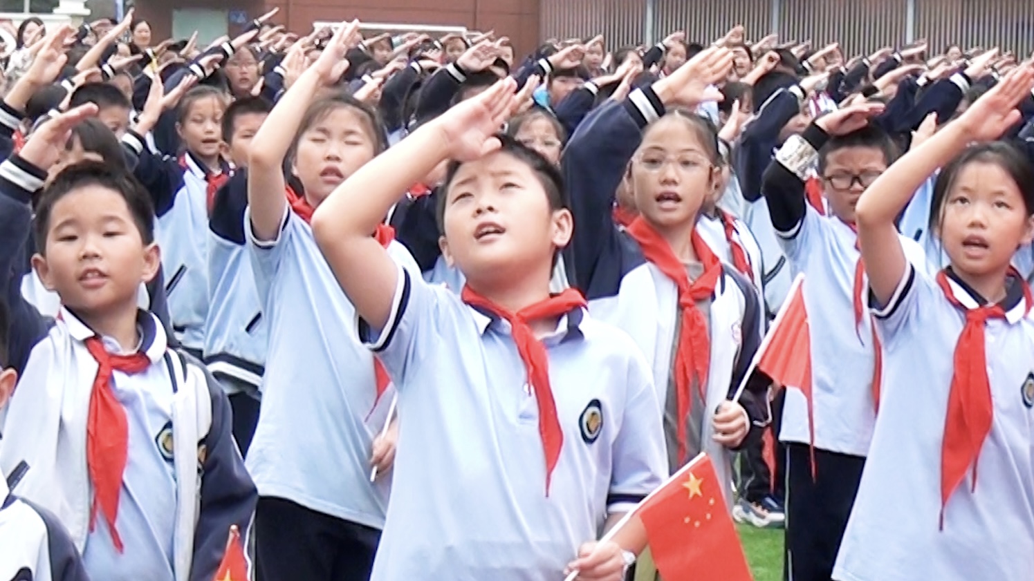 岳阳市红领巾电视台(记者:李宜睿 实习记者:余子晨):为引导新时代少年儿童表达对祖国的美好祝福,培养孩子爱祖国、爱人民、爱家乡的情感。9月26日上午,南湖新区金鹗小学党支部组织开展以“喜迎国庆 欢度中秋”为主题的第四周主题升旗仪式。