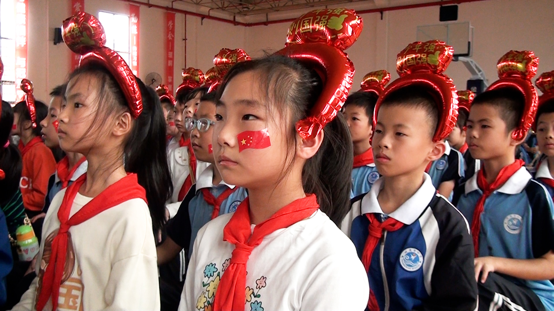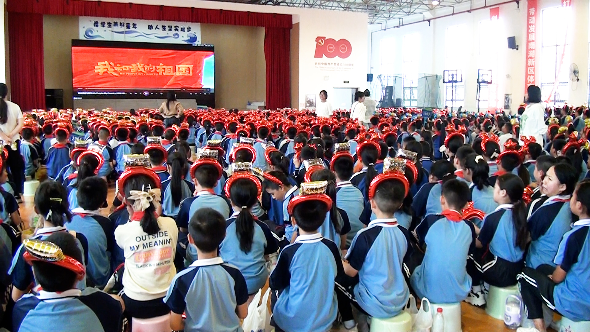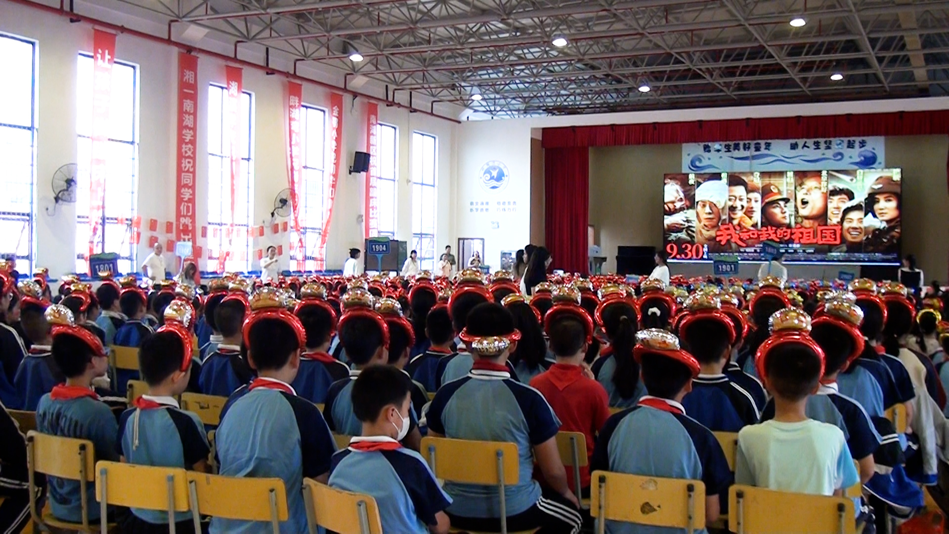 岳阳市红领巾电视台(记者:李宜睿 ):为庆祝新中国成立74周年,9月27日下午,南湖新区畔湖湾小学组织开展以“传承红色基因 向国旗敬礼”为主题的国庆观影活动,组织全体师生在室内篮球场观看爱国主义教育电影《我和我的祖国》。