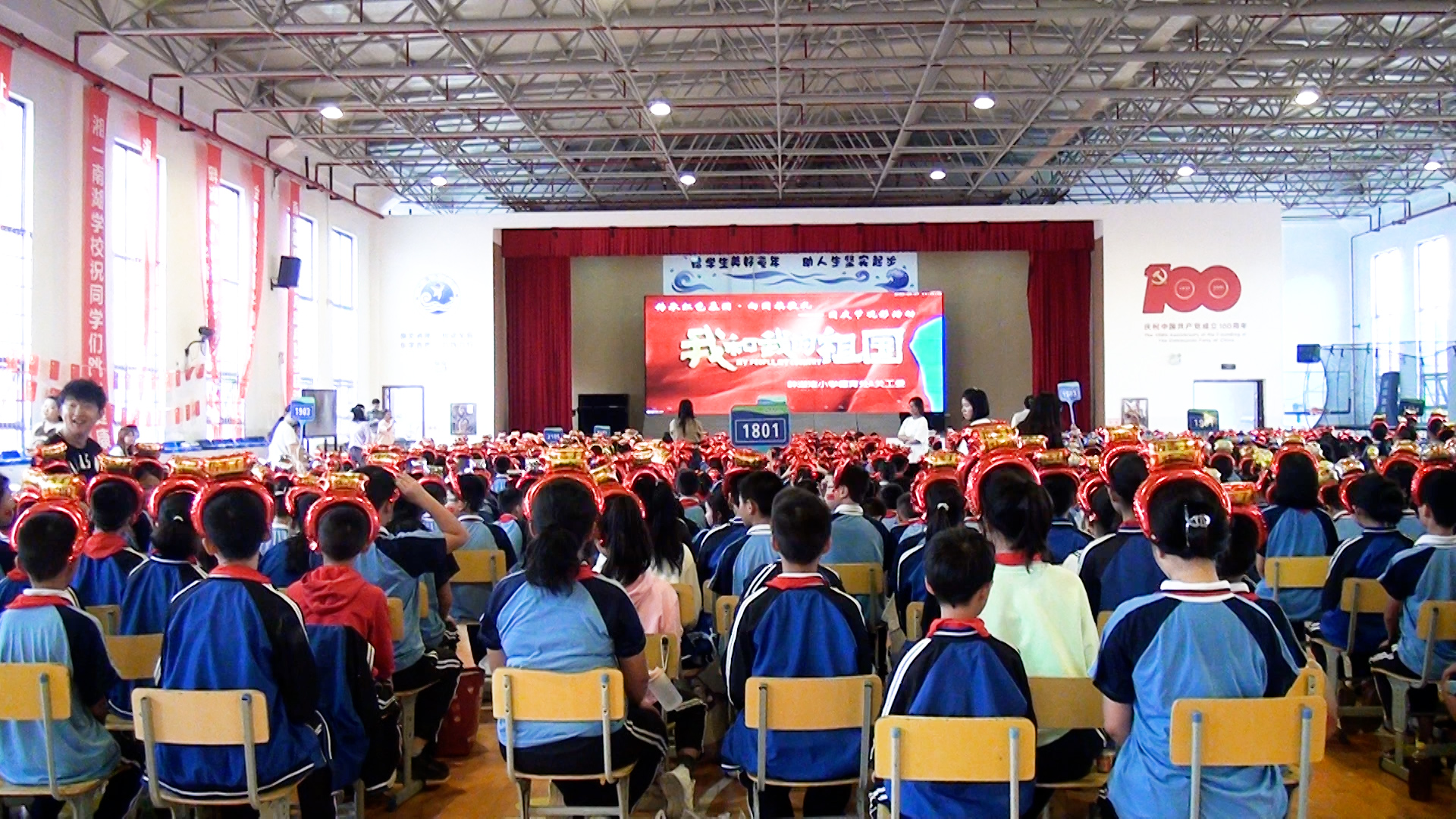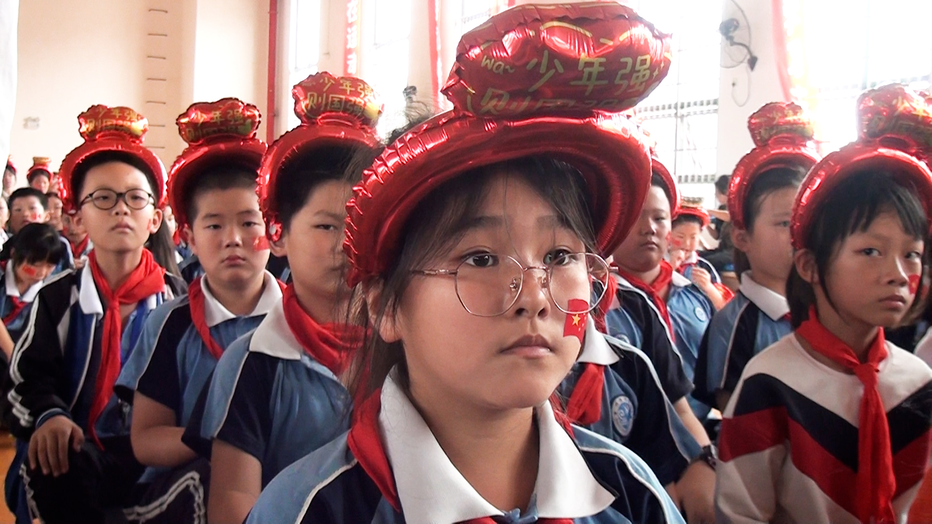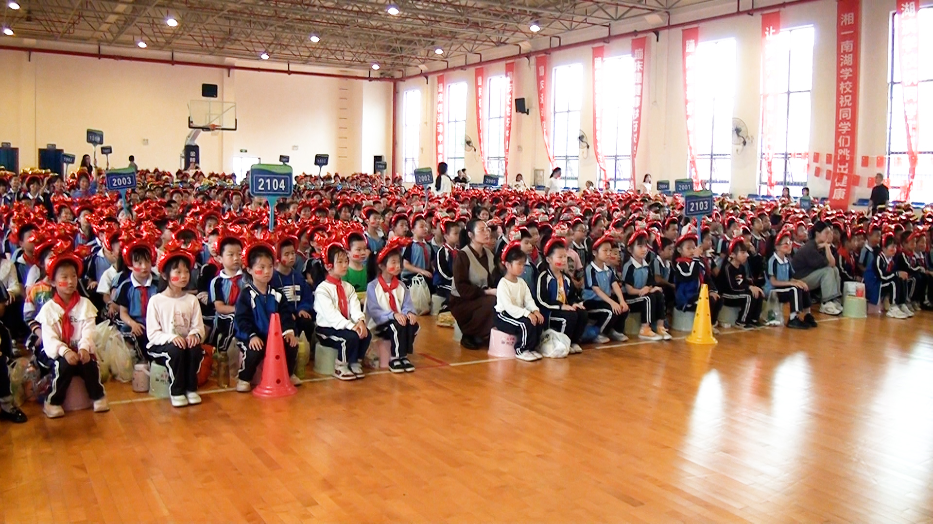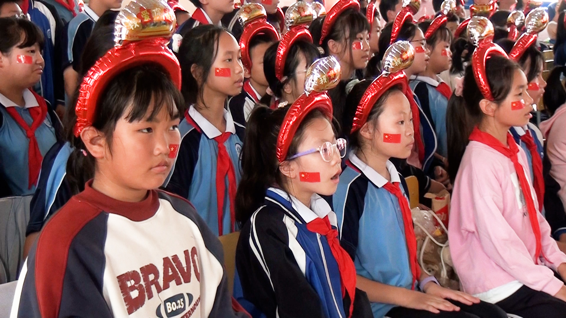 岳阳市红领巾电视台(记者:李宜睿 ):为庆祝新中国成立74周年,9月27日下午,南湖新区畔湖湾小学组织开展以“传承红色基因 向国旗敬礼”为主题的国庆观影活动,组织全体师生在室内篮球场观看爱国主义教育电影《我和我的祖国》。