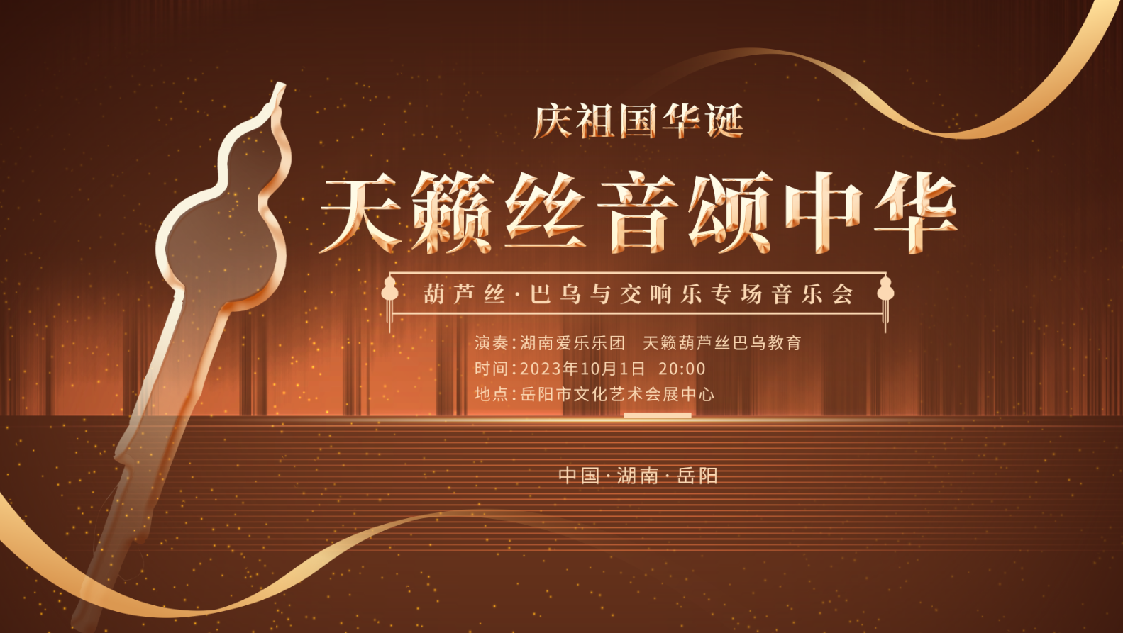 盛世华诞,举国同欢。10月1日,岳阳市天籁葫芦丝艺术教育机构与湖南爱乐乐团联合举办的“天籁丝音颂中华·葫芦丝巴乌与交响乐”音乐会将在岳阳文化艺术会展中心隆重举行。