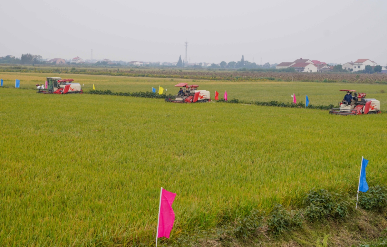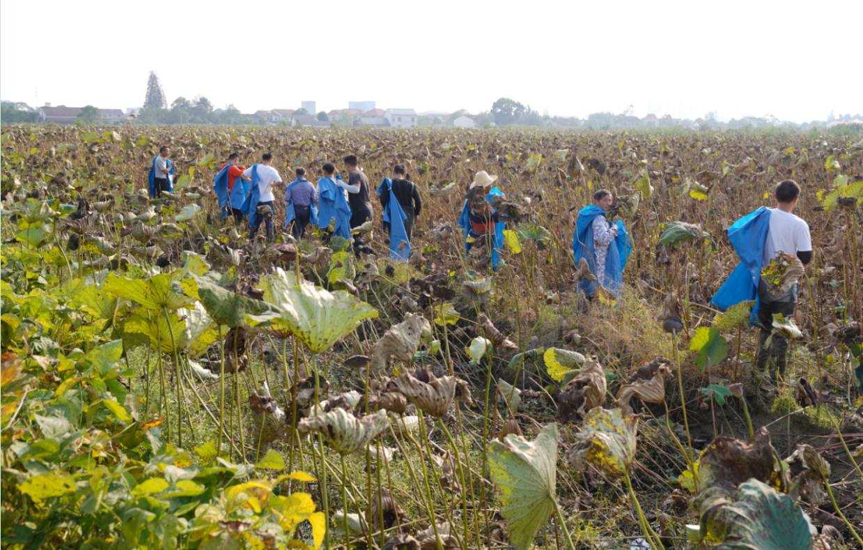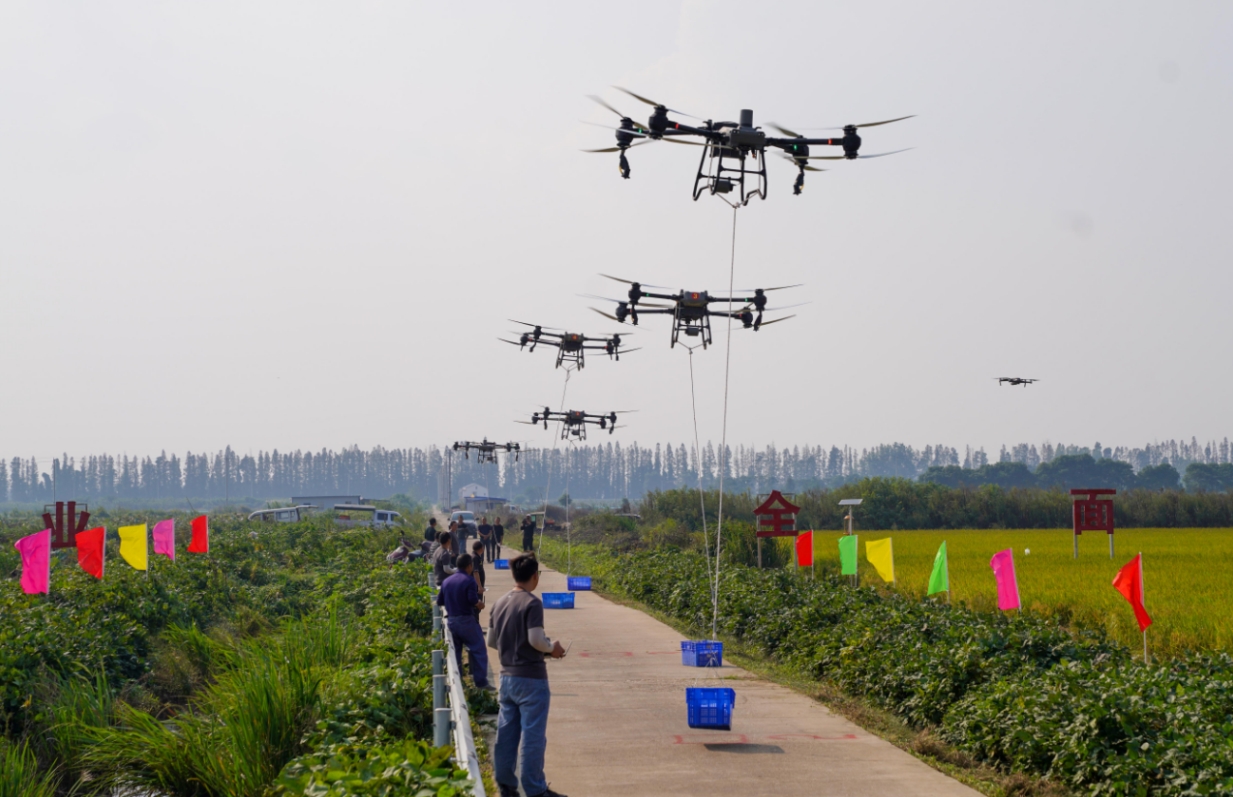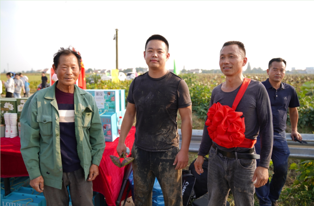 在丰收的田野,现场6台大型农用无人机,在农民飞手的精心操控下,逐一将摆在地面的50斤大米成功吊起。6台联合收割机一字排开,展开收割竞赛,这边荷田20名采莲高手在莲天飞奔,抢夺最好的莲蓬。那边观众区锣鼓喧天,呐喊声高,把乡村的金秋“丰”景,演绎激情四溢,热火朝天。